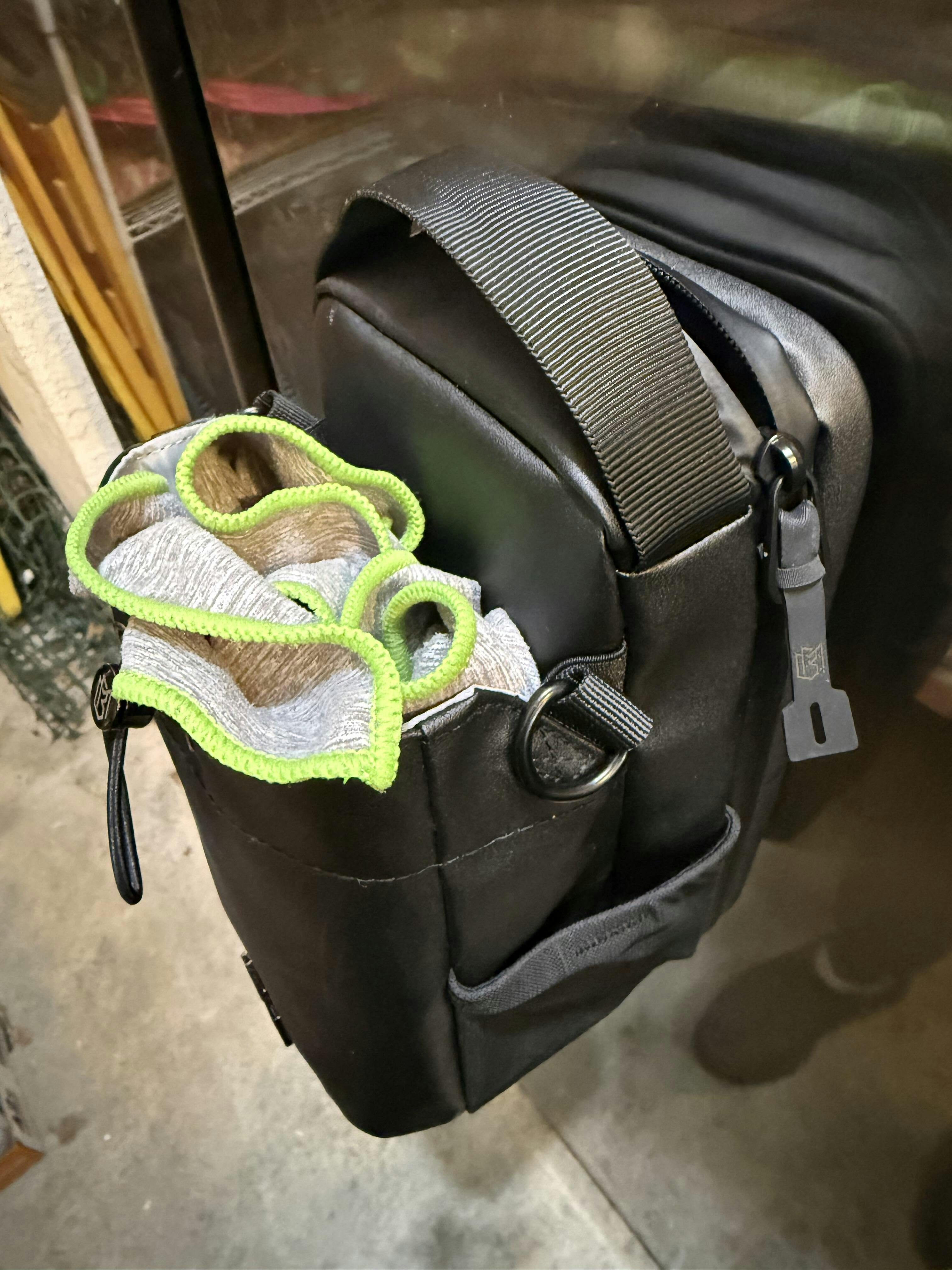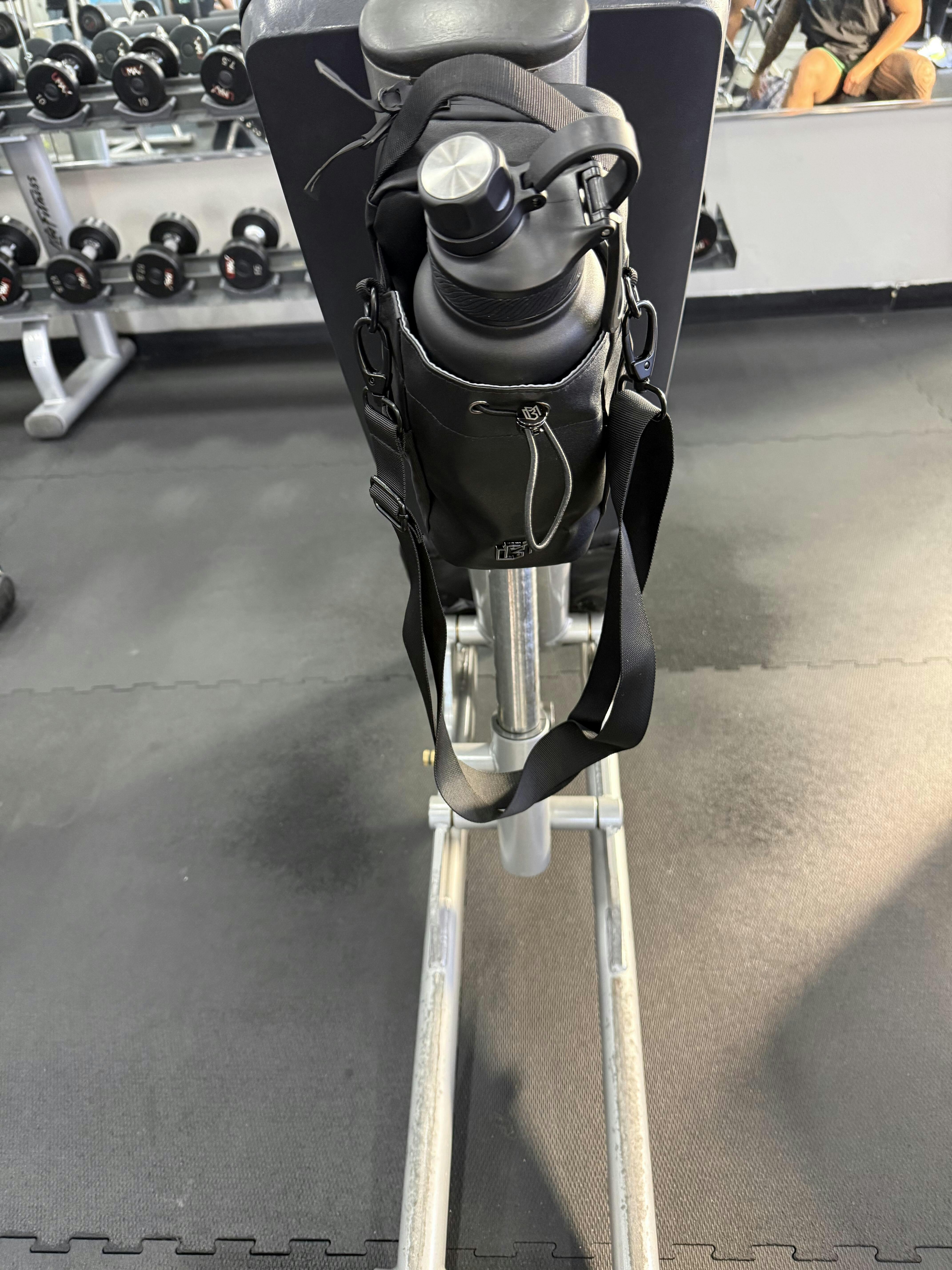 Very convenient way to keep all your gym gear in one place and still room for a full hydration bottle. Magnet holds the bag tight to gym equipment!