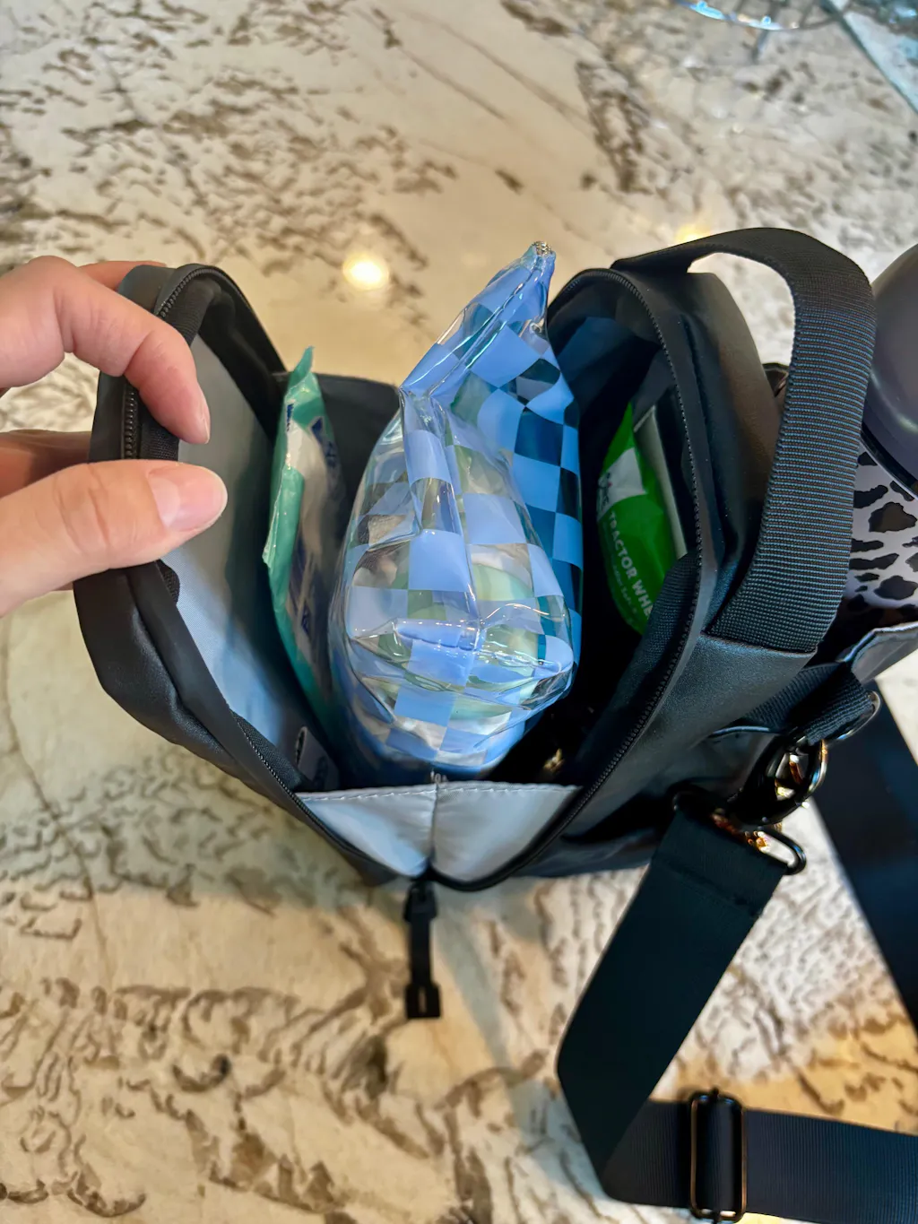 This was a birthday gift to my husband last year, but he said it wasn’t big enough. So my mom and I have used it to run errands. And it fits the essentials PLUS one diaper change. I have tried the hydrojug ease2o 20 oz fits great thanks to the tightening string. And I tried my 40 oz brumate era / flip in it. And it fits! We have the 46 oz magnetic bag. Waiting for the pink one to come out again so I can get it! 🩷🙏🏼 this bag stands out from the others because of the huge flexible compartment. Other “doops” don't have that. That is why I love this one. So keep that in mind. Hence the reasonable price tag.