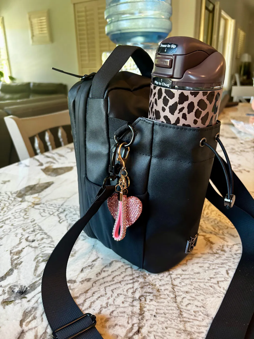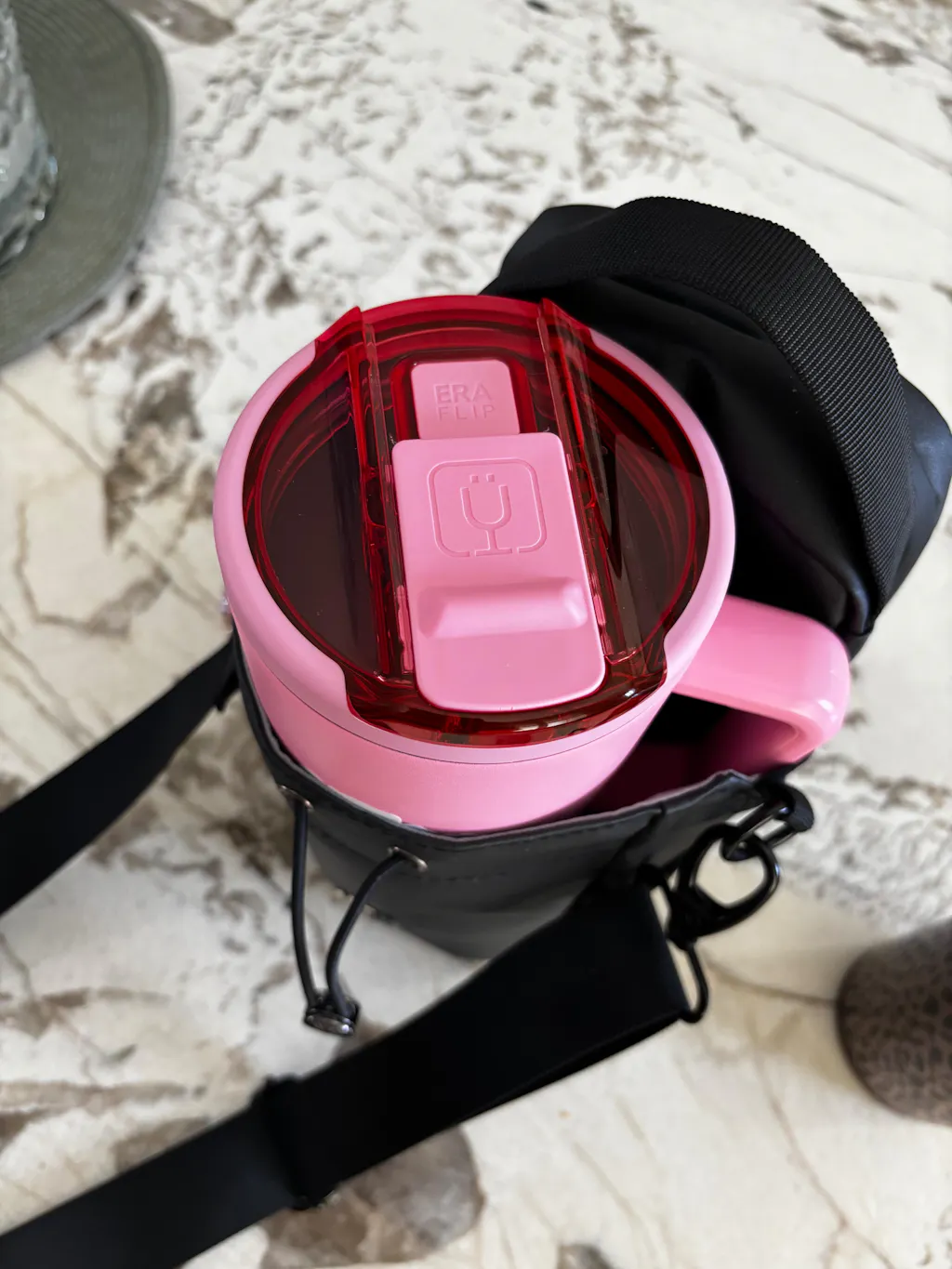 I work in a factory where I have to pull pallets of boxes all day with a pallet jack. I was struggling leaving my water everywhere in the factory or getting annoyed moving it every time I had to take boxes off a pallet. I purchased this bottle and bag and every day I slap it on the metal of my pallet jack and it goes everywhere with me throughout the day, keeping me hydrated. When I leave I slap the bag to the inside of my locker up high out the way so I can fit more in my locker if need be. 10/10 recommend to anyone in factory work 🖤